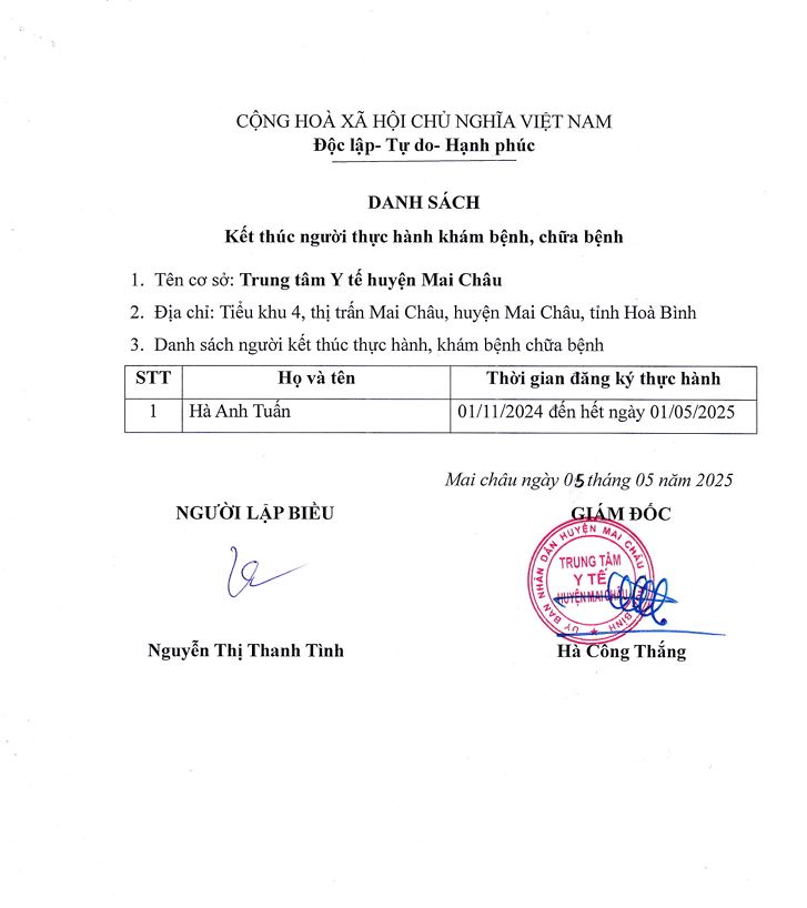 Danh sách kết thúc người thực hành khám bệnh, chữa bệnh. Trung tâm Y tế huyện Mai Châu Công văn Thông báo Văn bản Tháng 5 6, 2025Tháng 5 6, 2025Admin