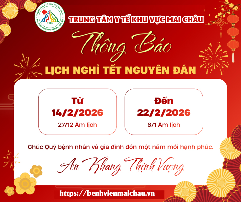 Trung tâm Y tế khu vực Mai Châu trân trọng thông báo lịch nghỉ Tết Nguyên đán 2026 đến quý người bệnh như sau:
